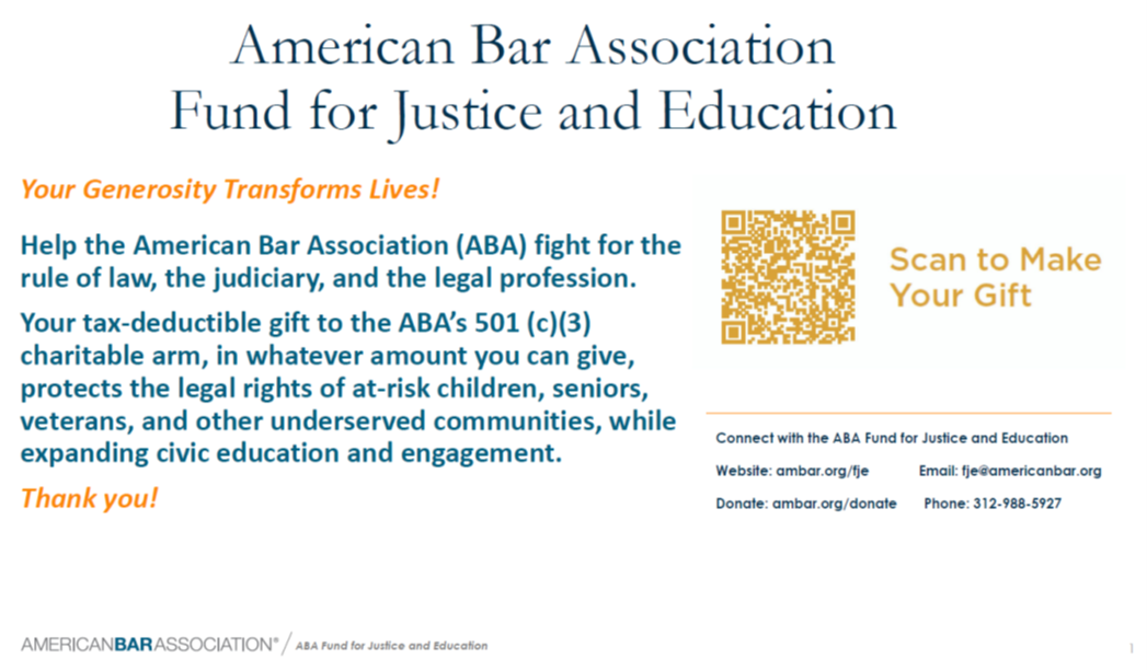 Cancellation Policy If you cannot attend, you may send a substitute. Requests for substitution must be submitted in via email to events@paralegals.org. If you must cancel, requests must be made via email as well. Cancellations received on or before September 22, 2025, are subject to a $50.00 fee. Cancellations received after September 22, 2025, will forfeit all fees. 2025 Convention Charity Partner Help the American Bar Association fight for the rule of law, the judiciary, and the legal profession. Together we can protect the legal rights of at-risk children, seniors, veterans, and other underserved communities, while expanding civic education and engagement. Join us with your tax-deductible gift in whatever amount you can give. Thank you.